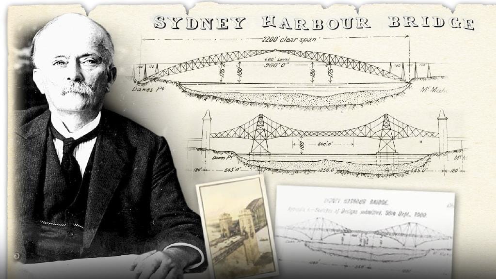 하버브리지 본격적인 건설은 1912년 '교량의 아버지'로 불렸던 존 브래드필드(John Bradfield)가 하버브릿지 책임 엔지니어로 임명되면서 교각이 없는 캔틸레버 교량을 제안합니다.