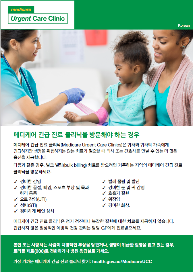 공휴일 또는 주말 병원이 문을 닫았을 때 긴급하지만 생명을 위협하지 않는 치료가 필요할 때 가까운 메디케어 긴급 진료 클리닉에 방문하시면 됩니다.