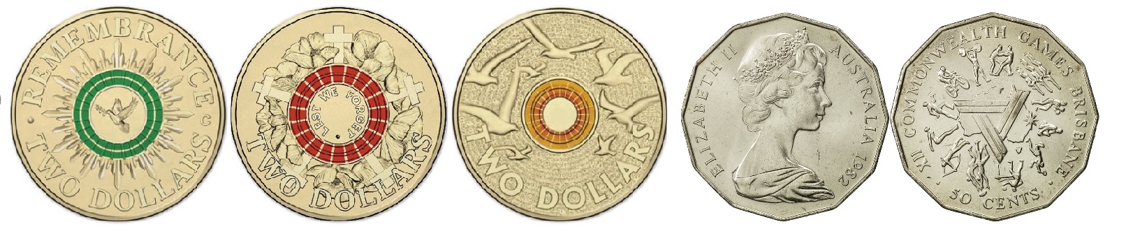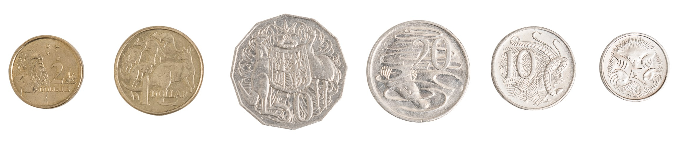 호주에서 유통되는 동전은 5C, 10C, 20C, 50C, A$1, A$2이며, 모양과 크기는 같지만 앞면에 새겨진 이미지는 여러 가지가 있다.